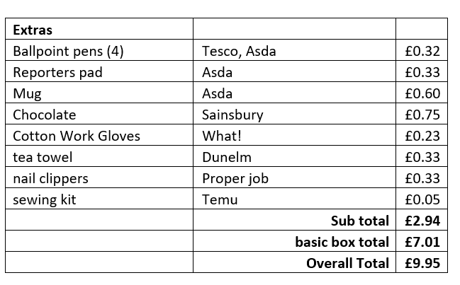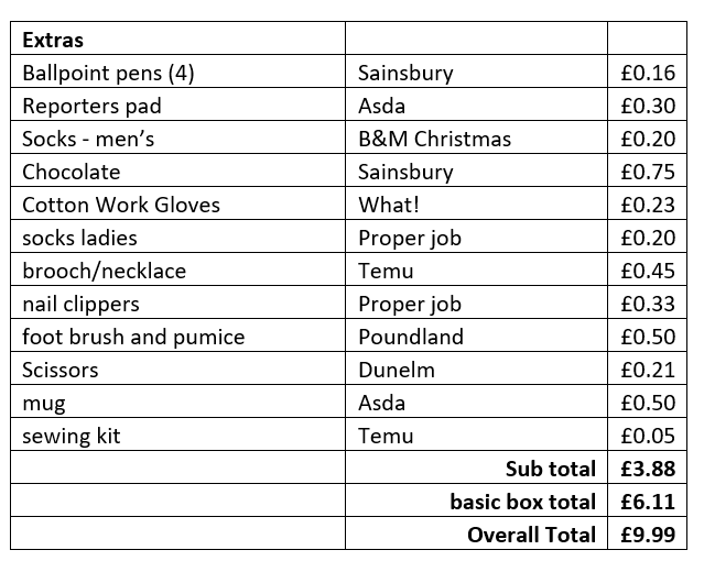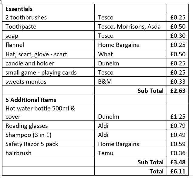 The first Shoebox is filled with bargains picked up over the year, to show if you start early you can get more for your money. I start out with the minimum requirements based on the Link to Hope leaflet and show the total for the minimum requirements, i.e. the 6 essential items and 5 additional items.