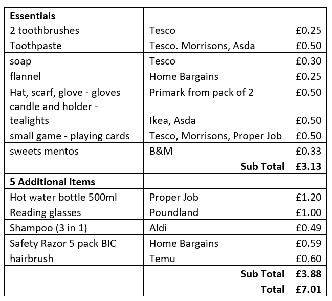 I’ve managed to fill a Family Shoebox for under £10.00 – could I do the same for an Elderly Shoebox? I’m pleased to say yes you can! It is getting tougher, but is possible, and if you use some of the suggestions in the fill a shoebox for free article, you should be able to pack a shoebox full of great gifts. The following shoeboxes don’t include any free items.