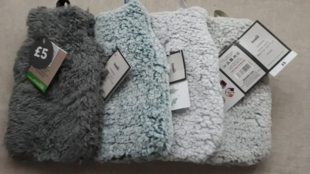 I’ll start with some hot water bottle bargains that are still available in some locations at the time of writing. Dunelm have 500ml hot water bottles with furry covers reduced from £5.00 to either £2.50 for pink, turquoise and grey or £1.25 for olive. The olive ones are only available in a few stores – some only have 1 left in stock but some seem to have 10 or more. They aren’t available for home delivery, so you made need to change store location to find somewhere near you that has them in stock. The south east and north east seemed to have a few locations with them in stock.