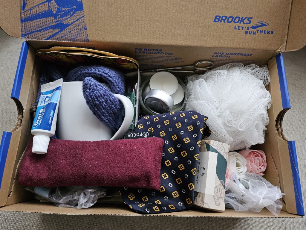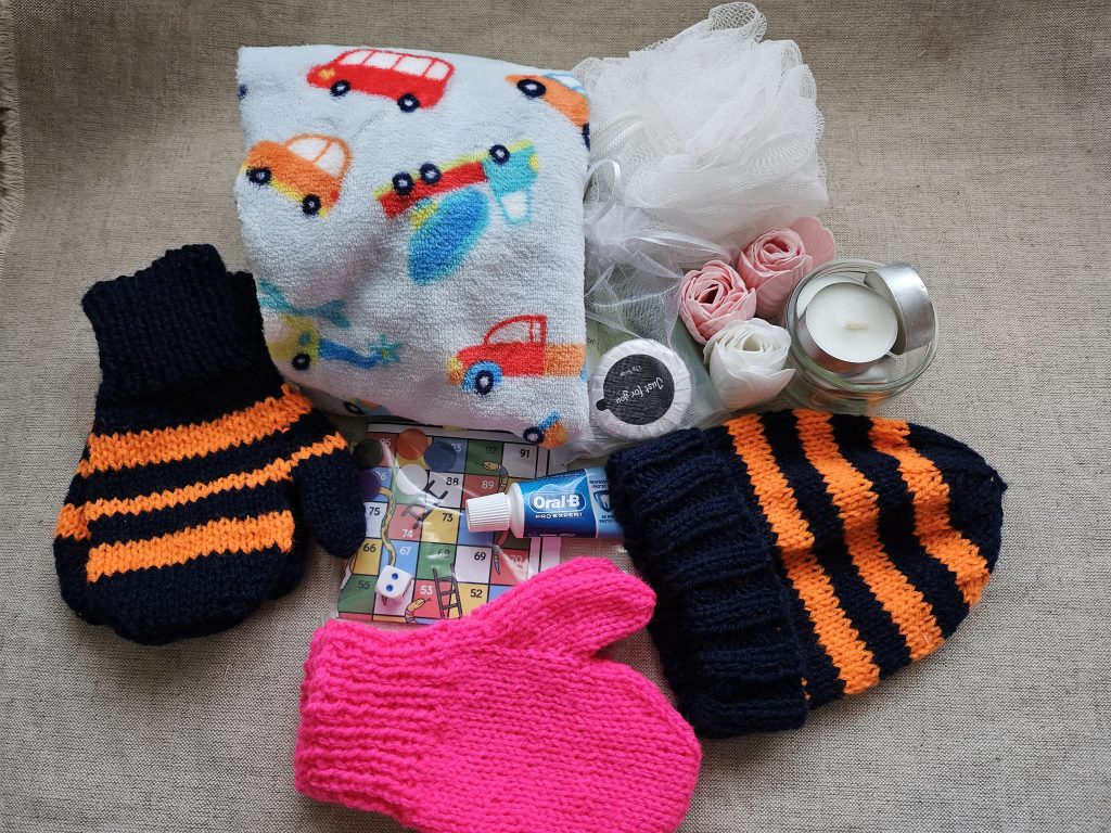 For the Family box Essentials, I added a scarf made from fleece fabric, and mittens and a beanie hat knitted from free wool from Freegle and Freecycle. I don’t have any free toothbrushes so would need to buy these (potentially 2 packs of 2 toothbrushes from Tesco for 25p per pack) and I haven’t had any free sweets or chocolates so would need to buy these. I’ve included tealights obtained from Freegle added into a GU style pot – also free – I’ve also received candles from Freegle. For the soap and flannel, I’ve included a small bar of soap from a hotel, and some soap roses and body buff puff from Freecycle, and for the small game added snakes and ladders printed out from the internet.