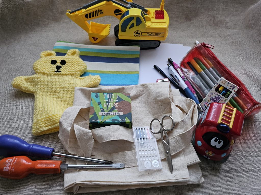For the small toys I’ve added a toy digger and small car both from Freegle, and for a soft toy added a hand puppet knitted with free wool from Freegle. I’ve included a couple of screwdrivers as DIY tools which were part of a haul of nearly 30 screwdrivers from Freegle and a sewing kit and small scissors also from Freegle. A bar of solid Shampoo from Freecycle, and a shopping bag from a conference.