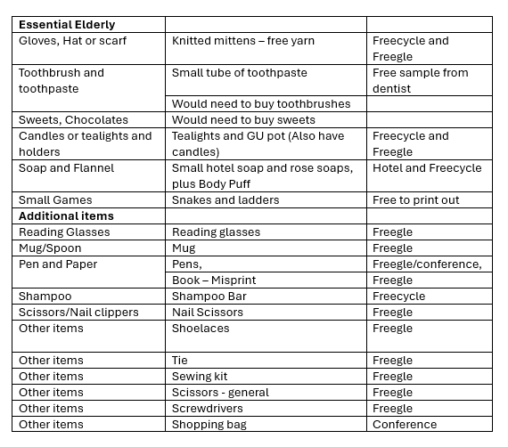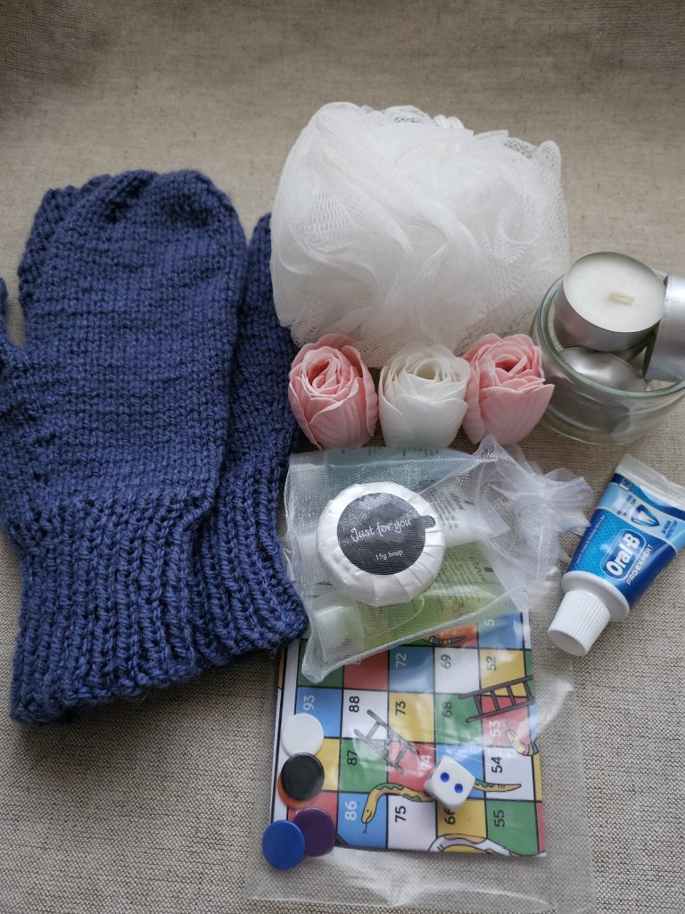 For the Elderly box Essentials, I’ve included some mittens knitted from free yarn. I don’t have any free toothbrushes so would need to buy these (potentially a double pack of toothbrushes from Tesco for 25p per pack). I haven’t had any free sweets or chocolates so would need to buy these. I’ve included tealights obtained from Freegle added into a GU style pot – also free – I’ve also received candles from Freegle. For the soap and flannel, I’ve included a small bar of soap from a hotel, and some soap roses and body buff puff from Freecycle, and for the small game added snakes and ladders printed out from the internet.