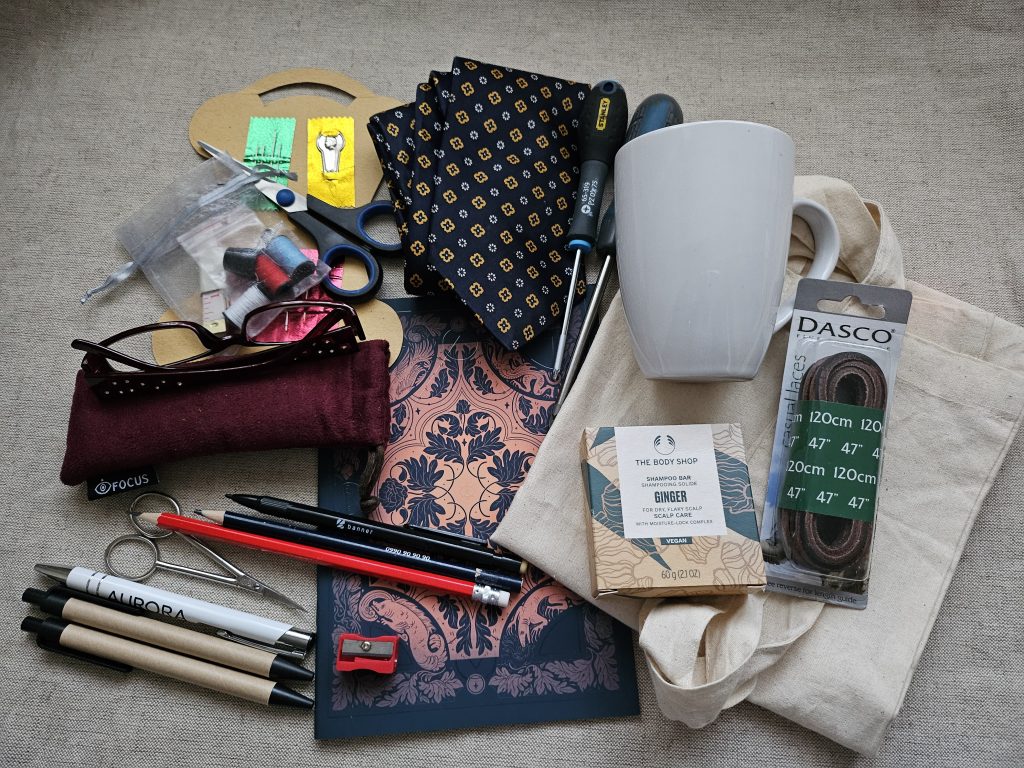For the additional items I’ve included reading glasses, a mug all from Freegle and biros from Freegle and conferences and a notebook from Freegle which was a misprint. A solid shampoo bar from Freecycle, along with nail scissors, shoelaces, a tie, sewing kit, general use scissors, and screwdrivers from Freegle, and a shopping bag from a conference.