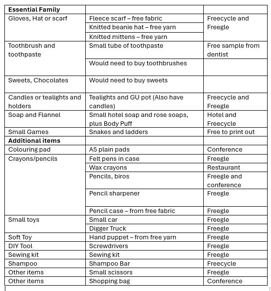 In addition to doing a £10.00 shoebox challenge for Link to Hope, I thought I’d see how close I could get to completing a shoebox with items obtained for free, mainly from re-use sites such as Freecycle and Freegle. https://www.freecycle.org/ https://www.ilovefreegle.org/